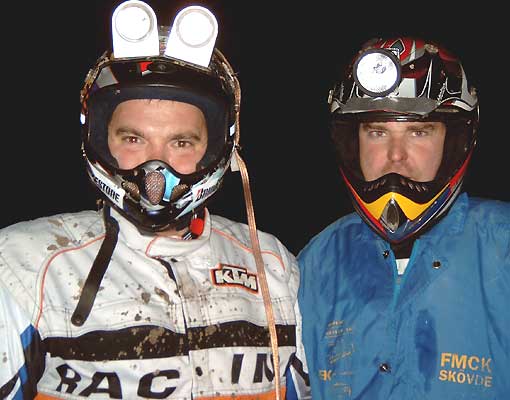Tidaholms MK Tidaholms MK >>> Tillbaka INFO Tidaholm MK arrangerade en mörkertävling lördagen den 25 oktober till glädje för alla "kåsa" entusiaster. För några stycken var detta en perfekt uppvärmning inför Novemberkåsan och att verkligen få testa grejerna. En som inte kommer att hinna träna så mycket mörkerkörning i höst är Fredrik Georgsson, han kommer att åka med ner till Brasilien och agera lagledare åt Sveriges juniorlag i Six-days. ![]() Två grabbar som vet hur man gasar! Anders Georgsson & Robban Svensson. FOTO: Mikael Sandberg Fredrik tillsammans i lag med äldre brodern Anders fick finna sej i att vara favoriter i tävlingen innan start då båda har för vana att placera sej duktigt i Novemberkåsan. I övrigt var det ett ganska klent startfält med endast femton startande lag, arrangören hoppades säkert på fler. Det ryktades innan att Peter Hansson skulle komma till start, Peter siktar på att fullfölja tio Novemberkåsor och det fattas två stycken innan han nått sitt mål. Men någon Hansson dök inte upp, han var med på en jubileums fest med Armèns lejon. ![]() Vem där? FOTO: Mikael Sandberg Bansträckningen var nästan samma som på vintercupen tidigare i år. Starten gick på ett gärde, ett par svängar i en trädgård och sedan vidare ut i skogen för att köra lite på motocrossbanan och sedan varva ur hojen på folkracebanan. Varvet tog ca: 11-12 minuter. Inte helt oväntat så infriade bröderna Georgsson alla förväntningar om en seger, det fanns inget lag som var i närheten att hota grabbarna. På andra platsen kom två gentlemän som framgångsrikt deltagit i årets RM serie för veteraner: FMCK skövdes Robert Svensson och Stefan Andersson Tibro MK. ![]() Kent Eriksson, Hjo MK. FOTO: Mikael Sandberg Stefan deltog mycket för att få testa lyset inför "kåsan" som är höstens stora prövning. Robban tänker inte köra kåsan utan provade istället ut de grejer som Daniel Johansson Tibro MK kommer att använda. Tredje platsen tog två duktiga juniorer från skövde, John Johansson och Marcus Perströmmer. Trots få startande blev det en bra tävling denna kväll och alla verkade nöjda. En eloge till Tidaholms MK som gör ett sådant här arrangemang, en kul idè och en kul tävling! 1. Anders Georgsson/Fredrik Georgsson, Tibro Mk, 17 varv, 3:04:05 10:53+10:47+10:46+10:32+11:05+10:53+10:56+10:49+10:24+10:24 +11:05+10:58+11:08+10:43+10:45+10:58+10:59 2. Robert Svensson, Fmck Skövde / Stefan Andersson, Tibro Mk, 16 varv, 3:02:20 11:10+10:59+11:38+11:45+11:24+11:31+11:44+11:23+11:24+11:14 +11:30+11:15+11:21+11:17+11:24+11:21 3. John Johansson/Marcus Perströmmer, Fmck Skövde, 16 varv, 3:08:12 11:38+11:33+11:19+12:54+12:22+12:02+11:35+11:14+11:07+12:24 +11:50+12:07+11:33+11:08+11:13+12:13 4. Andreas Johansson/Mikael Persson, Fmck Skövde, 16 varv, 3:11:32 2:16+11:49+11:49+11:22+14:57+11:39+11:06+11:13+11:09+13:08 +12:44+11:30+11:14+12:41+11:27+11:2 5. Anders Jonsson/Lars-Erik Jonsson, Tibro Mk, 15 varv, 3:04:52 11:58+11:56+11:57+12:23+11:43+12:10+12:24+11:36+17:10+11:45 +11:50+12:11+11:58+12:02+11:49 6. Fredrik Cedin/Christian Johansson, Tidaholms Mk, 15 varv 3:08:45 12:43+12:07+12:13+12:34+12:32+12:15+12:44+12:27+12:45+12:30 +12:52+12:42+12:49+13:06+12:26 7. John Stålborg/Fredrik Dahl, Fmck Skövde, 15 varv, 3:09:53 13:16+12:17+13:32+13:15+12:16+11:56+13:04+13:02+12:18+11:52 +12:54+13:08+12:10+11:43+13:10 8. Rickard Edlund/Jonas Johansson, Tidaholms Mk, 15 varv, 3:11:57 12:35+12:50+11:58+12:31+13:06+13:20+13:11+12:38+12:23+13:24 +13:05+12:51+13:01+12:30+12:34 9. Mikael Johansson/Rickard Klahr, Tidaholms Mk, 14 varv, 3:02:05 12:40+12:21+12:27+13:50+13:06+12:51+12:46+12:20+13:01+12:39 +13:38+13:23+12:59+14:04 10. Tomas Aronsson/Roland Moberg, Töreboda Mk, 14 varv, 3:07:33 13:13+12:49+12:45+13:46+13:14+12:58+12:29+14:02+12:43+13:55 +13:34+12:44+12:56+16:25 11. Mikael Staaf, Tibro Mk / Daniel Enedahl, Fmck Skövde, 14 varv, 3:13:39 12:38+13:16+12:18+15:37+12:56+12:27+12:34+18:58+12:39+13:26 +15:40+13:13+13:39+14:18 12. Anders Brandoff/Kent Eriksson, Hjo Mk, 13 varv, 3:00:37 13:50+13:41+13:53+13:24+15:17+13:22+13:51+13:14+13:46+14:29 +13:49+13:52+14:09 13. Per Klahr/Erik Klahr, Tidaholms Mk, 13 varv, 3:09:23 13:10+13:30+13:33+13:39+20:23+13:54+13:53+13:09+14:51+13:55 +14:11+15:11+16:04 14. Raine Larsson/Peter Johansson, Hjo Mk, 12 varv, 3:05:53 14:41+14:40+16:43+15:34+15:58+15:41+15:52+14:37+16:22+14:30 +15:40+15:35 15. Stefan Andersson/Mikael Johansson, Fmck Skövde, 4 varv, 0:53:57 13:19+12:31+13:57+14:10 Tidaholms MK >>> Tillbaka INFO |